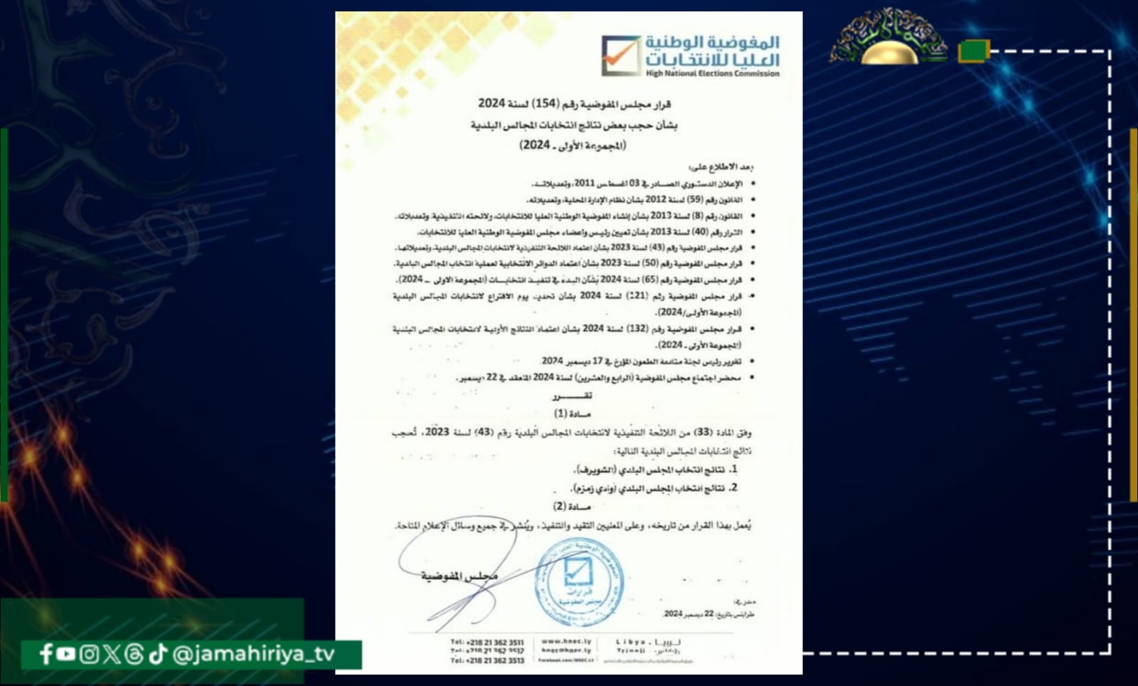 وأوضحت المفوضية العليا للانتخابات، حجب نتائج انتخابات المجالس البلدية المجموعة الأولى ، في كل من بلديتي الشويرف ووادي زمزم، وجاء ذلك في منشور على صفحتها اليوم.