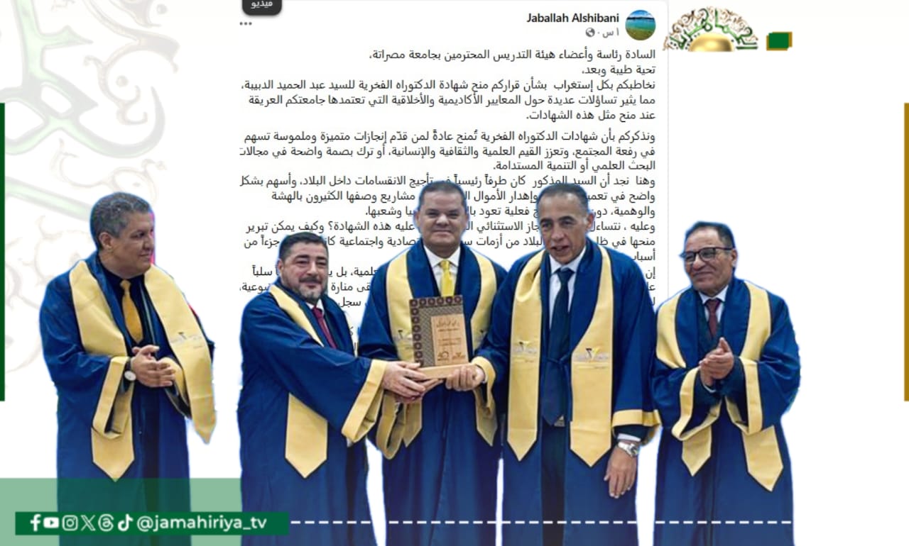 وواصل نتساءل، ما هو الإنجاز الاستثنائي الذي استحق عليه هذه الشهادة؟ وكيف يمكن تبرير منحها في ظل ما تعانيه البلاد من أزمات سياسية واقتصادية واجتماعية كانت إداراته جزءاً من أسباب تفاقمها؟. موضحا: هذا الإجراء لا يؤثر فقط على سمعة الجامعة ومصداقيتها العلمية، بل ينعكس أيضاً سلباً على صورة المؤسسات الأكاديمية الليبية، التي يفترض بها أن تبقى منارة للعلم والموضوعية، لا أداة تزيين صور الشخصيات العامة أو مكافأة من يفتقدون إلى سجل مشرف في خدمة الوطن والمواطنين.