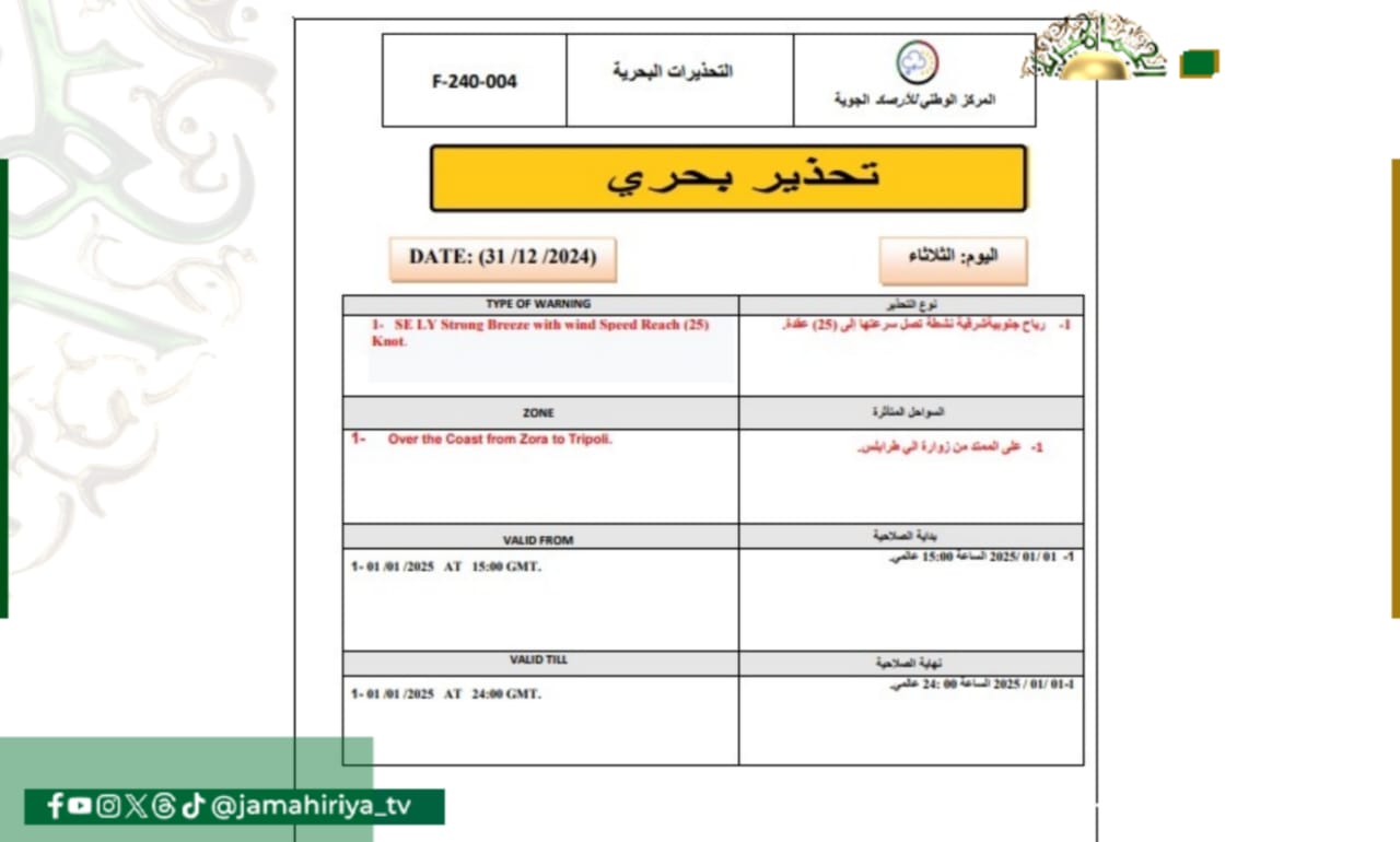 عاجل// تحذير بحري من رياح جنوبية شرقية تصل سرعتها إلى 25 عقدة على الساحل الممتد من زوارة إلى طرابلس.