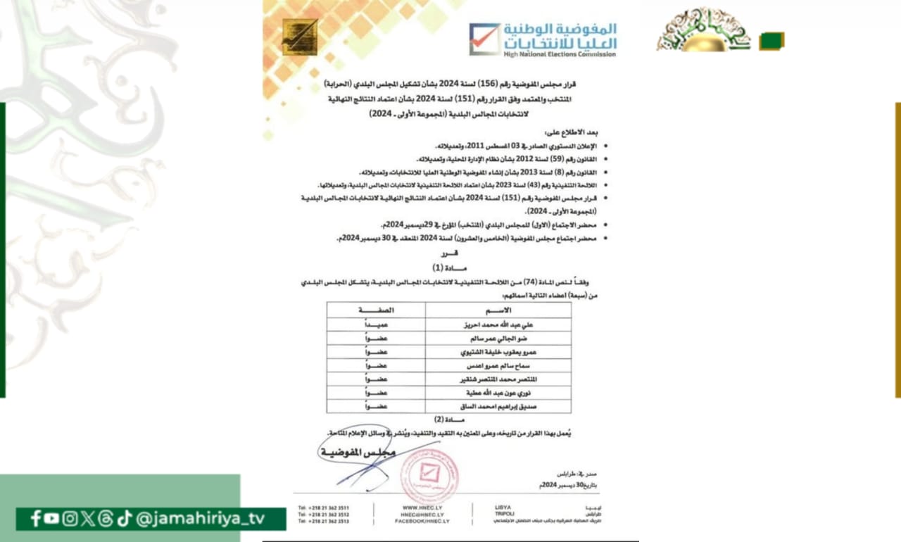 وشملت القرارات، وفق بيان طالعته “الجماهيرية”، عدد (56) بلدية متضمنة قائمة بأسماء عميد وأعضاء المجلس في كل بلدية من البلديات.