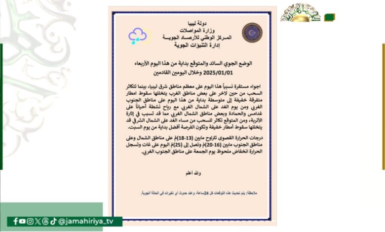 وجاء بيان الأحوال الجوية المتوقعة على ليبيا اليوم كالتالي