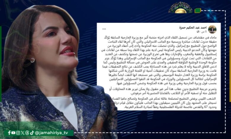 وتابع، وها هي تخرج الوزيرة عن صمتها وتكشف عن العديد من اللقاءات التي تمت لوزراء ومسؤولين في الحكومة مع الجانب الإسرائيلي وهذا يُؤكّد عزم حكومة الوحدة الوطنية المُؤقتة الحقيقي والجدي على الخوض في مسألة التطبيع، وليس كما ادعي الآفاق الدبيبة وأنه لا يعلم شئ عن هذه المسألة. وشدد حمزة، يجب الكشف عن نتائج التحقيقات فيما قامت به وزيرة الخارجية السابقة، سواء كان تحقيقات أمنية او اللجنة الوزارية التي شكلتها الحكومة برئاسة وزيرة العدل حليمة البوسيفي والتي غير مستبعد، انها التقت ايضاً نظيرها الإسرائيلي لطالما كل المسؤولين والوزراء في الحكومة قد التقوا المسؤولين الاسرائيليين بحسب قول وزيرة الخارجية وهي وزيرة في هذه الحكومة وضمن المسؤولين فيها.