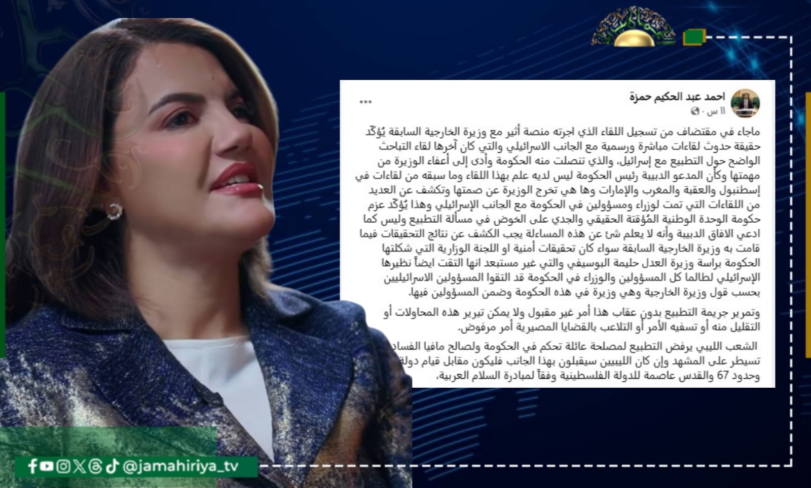 وعلق حمزة في تدوينة له على صفحته على موقع فيس بوك قائلا: ما جاء في مقتطفات من تسجيل اللقاء الذي اجرته منصة أثير مع وزيرة الخارجية السابقة، يُؤكّد حقيقة حدوث لقاءات مباشرة ورسمية مع الجانب الاسرائيلي والتي كان آخرها لقاء التباحث الواضح حول التطبيع مع إسرائيل، والذي تنصلت منه الحكومة، وأدى إلى أعفاء الوزيرة من مهمتها وكأن المدعو الدبيبة رئيس الحكومة ليس لديه علم بهذا اللقاء وما سبقه من لقاءات في إسطنبول والعقبة والمغرب والإمارات.