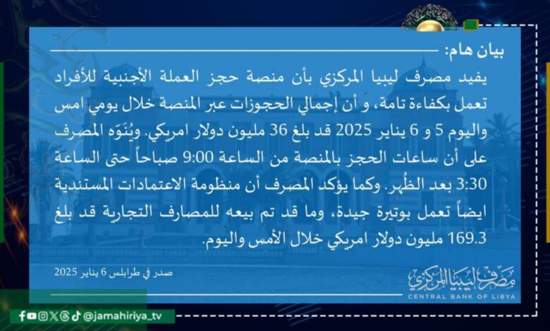 عاجل// مصرف ليبيا المركزي: منصة حجز العملة الأجنبية للأفراد تعمل بكفاءة تامة وإجمالي الحجوزات عبر المنصة خلال يومي أمس واليوم بلغ 36 مليون دولار.
