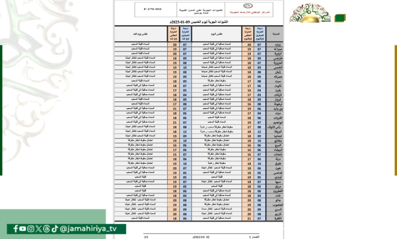 ومن المتوقع حدوث تقلبات جوية منتصف الأسبوع القادم على بعض مناطق شمال ليبيا وسنوافيكم بالتفاصيل في نشراتنا القادمة.