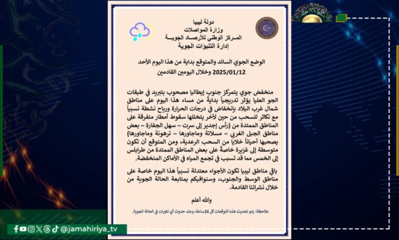 وجاء بيان الأحوال الجوية المتوقعة على ليبيا اليوم كالتالي: