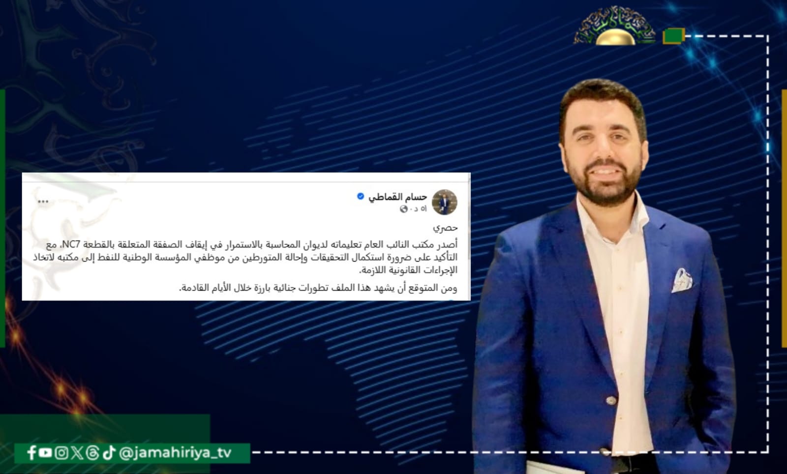 قال الناشط حسام القماطي، إن مكتب النائب العام اصدر تعليماته لديوان المحاسبة بالاستمرار في إيقاف الصفقة المتعلقة بالقطعة NC7، مع التأكيد على ضرورة استكمال التحقيقات وإحالة المتورطين من موظفي المؤسسة الوطنية للنفط إلى مكتبه لاتخاذ الإجراءات القانونية اللازمة.