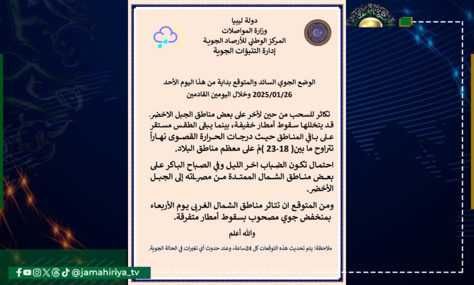 توقع مركز الأرصاد الجوية، تكاثر للسحب من حين لأخر على بعض مناطق الجبل الاخضر قد يتخللها سقوط أمطار خفيفة، بينما يبقى الطقس مستقر على باقي المناطق حيث درجات الحرارة القصوى نهاراً تتراوح ما بين( 18-23 )مْ على معظم مناطق البلاد.