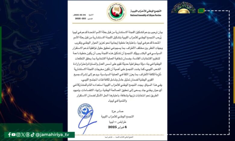 رحب التجمع الوطني للأحزاب الليبية، بتشكيل اللجنة الاستشارية من قبل بعثة الأمم المتحدة للدعم في ليبيا، باعتبارها خطوة إيجابية نحو تعزيز الحوار الوطني وتقريب وجهات النظر بين مختلف الأطراف، بما يسهم في تحقيق حلول توافقية تدعم الاستقرار السياسي في البلاد.