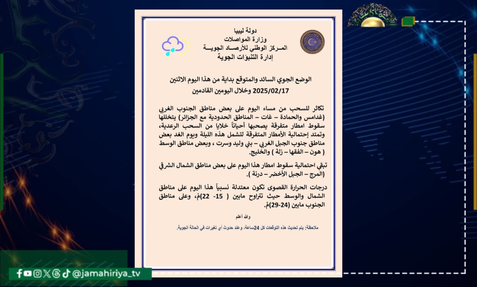 توقع مركز الأرصاد الجوية تكاثر السحب مساء اليوم الإثنين على بعض مناطق الجنوب الغربي (غدامس والحمادة – غات – المناطق الحدودية مع الجزائر) يتخللها سقوط أمطار متفرقة يصحبها أحياناً خلايا من السحب الرعدية.