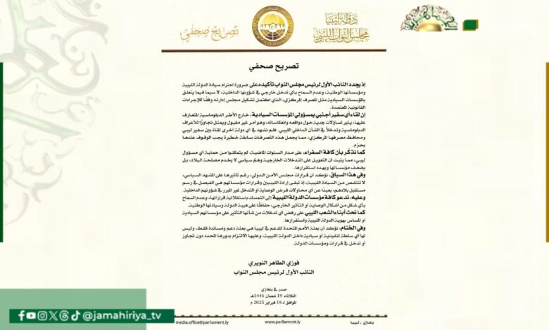 أكد النائب الأول لرئيس مجلس النواب، فوزي النويري، على ضرورة احترام سيادة الدولة الليبية ومؤسساتها، وعدم السماح بأي تدخل خارجي في شؤونها الداخلية، لا سيما فيما يتعلق بالمؤسسات السيادية مثل المصرف المركزي، الذي اكتمل تشكيل مجلس إدارته وفقًا للإجراءات القانونية المعتمدة.