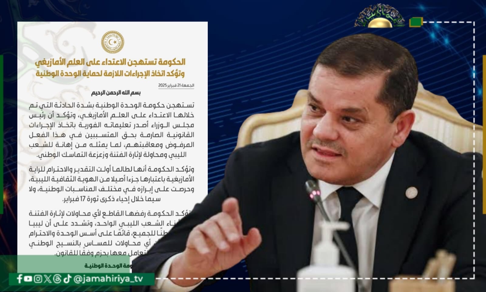 استنكر رئيس حكومة التطبيع”عبد الحميد الدبيبة” حادثة الاعتداء على العلم الأمازيغي، مؤكدا اتخاذ الإجراءات القانونية الصارمة بحق المتسببين في الاعتداء على العلم الأمازيغي.