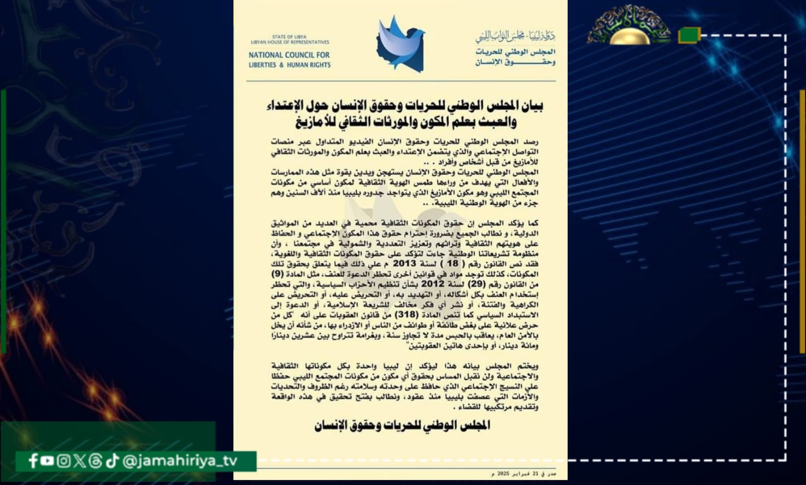 أصدر مجلس الحريات وحقوق الإنسان، بيانًا يستنكر فيه بشدة الاعتداء والعبث بعلم المكون الأمازيغي، بعد انتشار فيديو على منصات التواصل الاجتماعي يُظهر هذا الفعل، معتبرًا إياه محاولة لطمس الهوية الثقافية لأحد المكونات الأساسية للمجتمع الليبي.