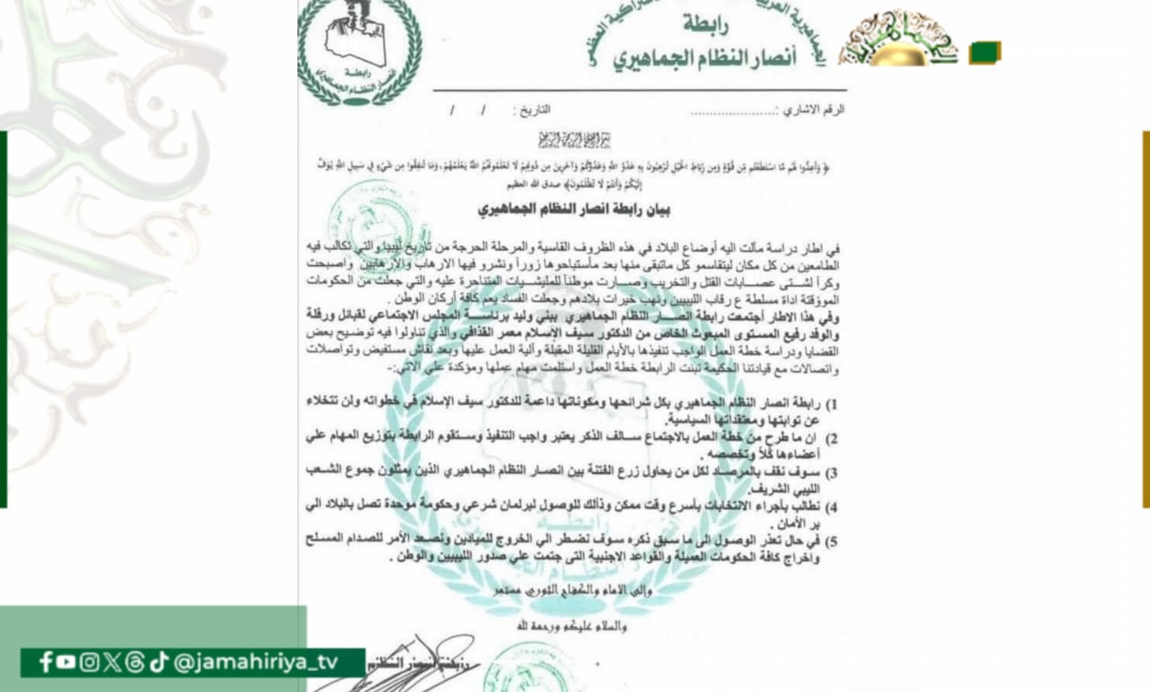 وشددت الرابطة على أنها سوف تقف بالمرصاد لكل من يحاول زرع الفتنة بين أنصار النظام الجماهيري الذين يمثلون جموع الشعب الليبي الشريف، مطالبة بإجراء الانتخابات بأسرع وقت ممكن وذلك للوصول إلى برلمان شرعي وحكومة موحدة تصل بالبلاد إلى بر الأمان.