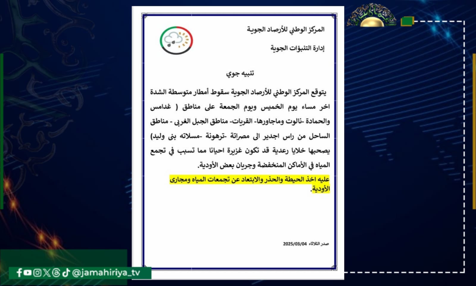 عاجل// الأرصاد تحذر من سقوط أمطار متوسطة الشدة يصحبها خلايا رعدية على مناطق غدامس والحمادة ونالوت، مساء الخميس والجمعة.