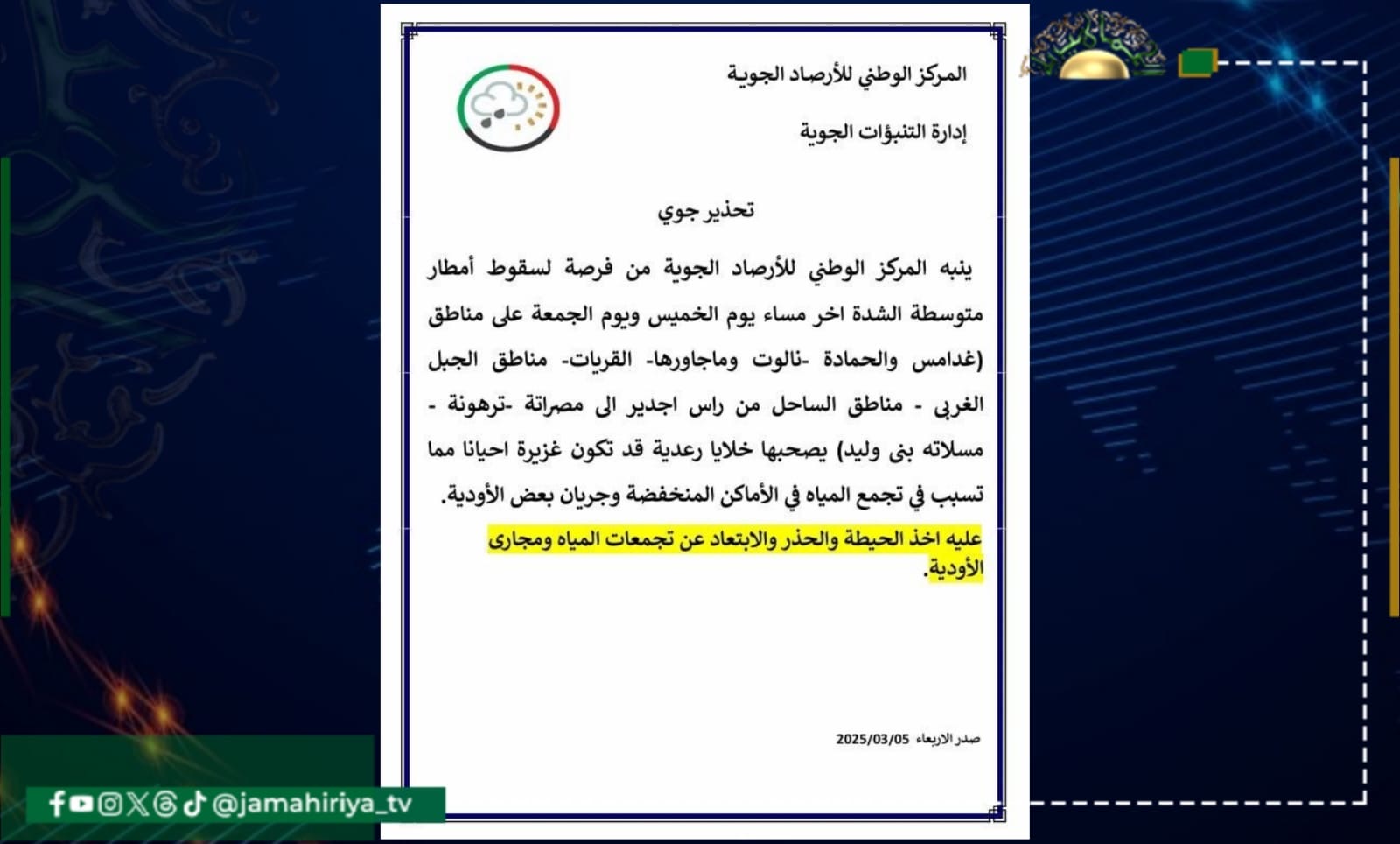 حذر المركز الوطني للأرصاد الجوية من احتمالية هطول أمطار متوسطة إلى شديدة الغزارة مساء يومي الخميس والجمعة.