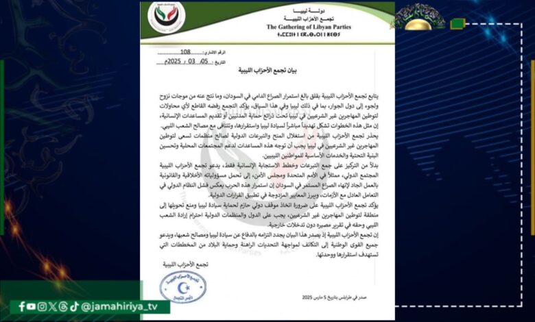 وأشار التجمع الى أن هناك محاولات لاستغلال المنح الدولية لصالح منظمات تسعى لتوطين المهاجرين في ليبيا، داعيا الأمم المتحدة ومجلس الأمن لتحمل مسؤولياتهما الأخلاقية والقانونية بالعمل لإنهاء الصراع في السودان، بدلا من السعي لتوطين المهاجرين في الأراضي الليبية.