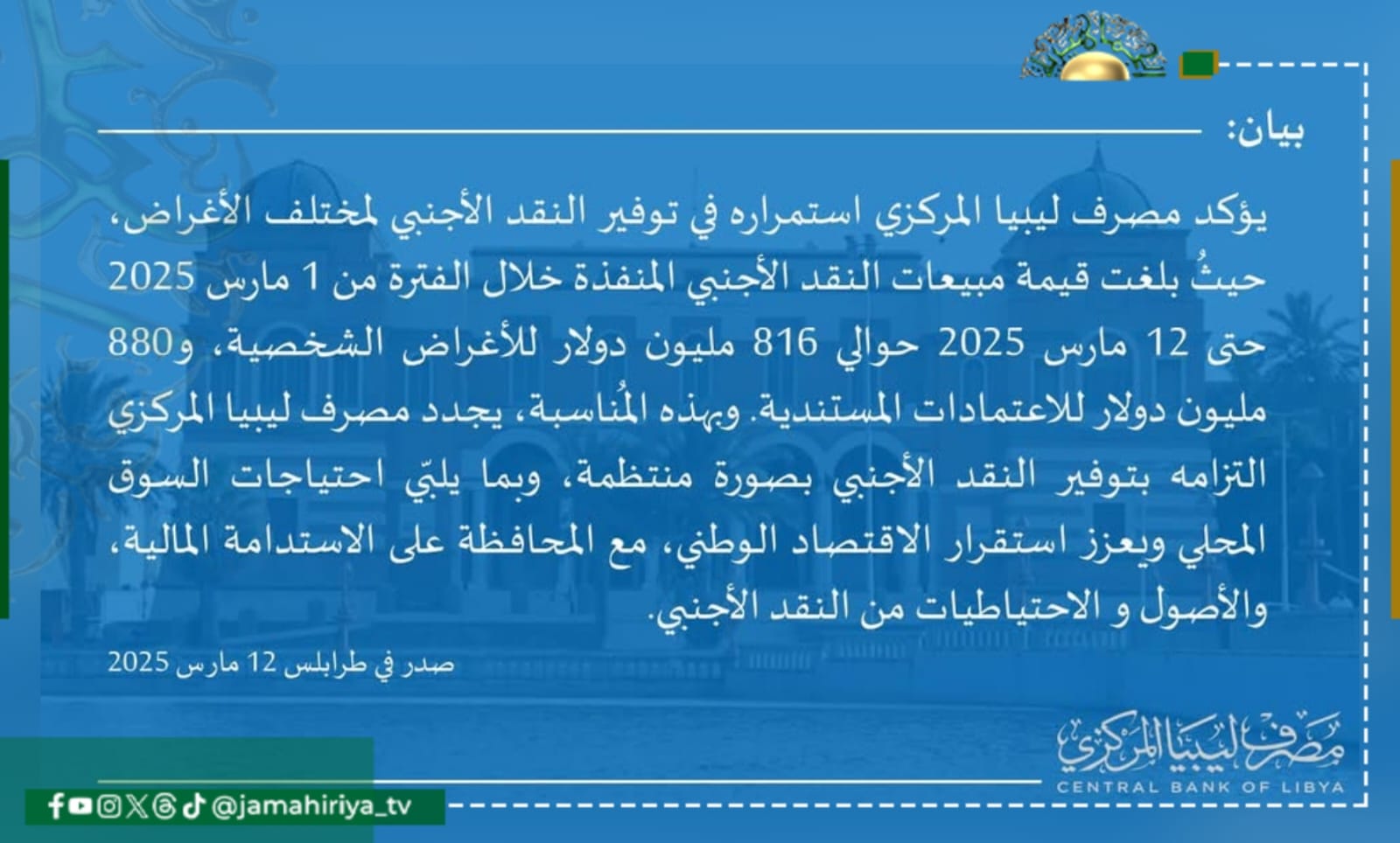 أكد مصرف ليبيا المركزي، استمراره في توفير النقد الأجنبي لمختلف الأغراض، حيث بلغت قيمة مبيعات النقد الأجنبي المنفذة خلال الفترة من 1 مارس 2025 حتى 12 مارس 2025 حوالي 816 مليون دولار للأغراض الشخصية، و880 مليون دولار للاعتمادات المستندية.