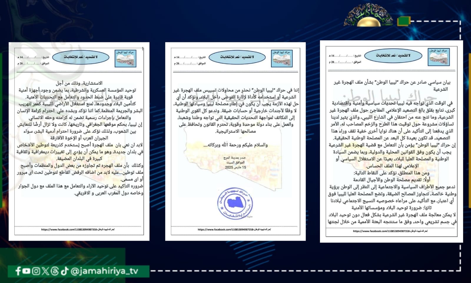 وطالب الحراك، في بيان، جميع الأطراف السياسية والاجتماعية بالنظر إلى الوطن برؤية وطنية خالصة، تتجاوز المصالح الضيقة، مؤكدًا على ضرورة توحيد البلاد ومؤسساتها الأمنية من أجل معالجة ملف الهجرة غير الشرعية بشكل فعال، بالإضافة إلى توحيد المؤسسة العسكرية والشرطية لضمان وجود أجهزة قوية قادرة على ضبط الحدود والتعامل مع التحديات الأمنية.