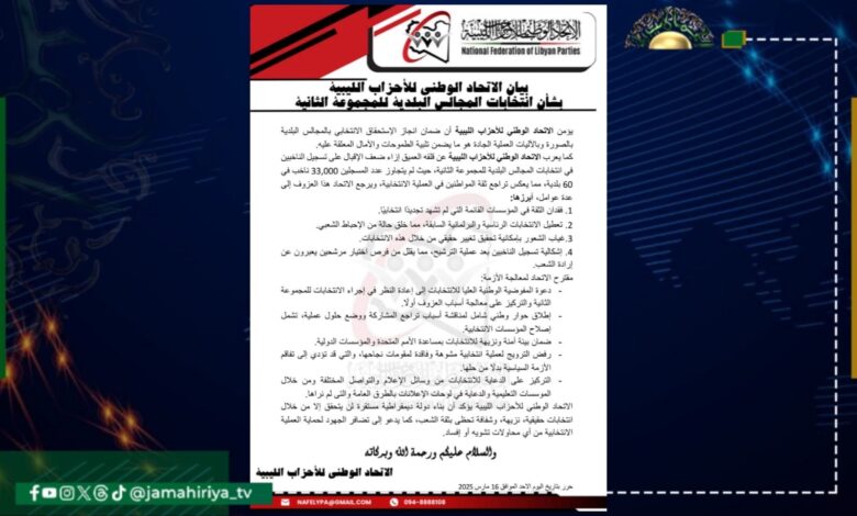 طالب الاتحاد الوطني للأحزاب الليبية المفوضية الوطنية العليا للانتخابات بإعادة النظر في إجراء الانتخابات للمجموعة الثانية والتركيز على معالجة أسباب العزوف