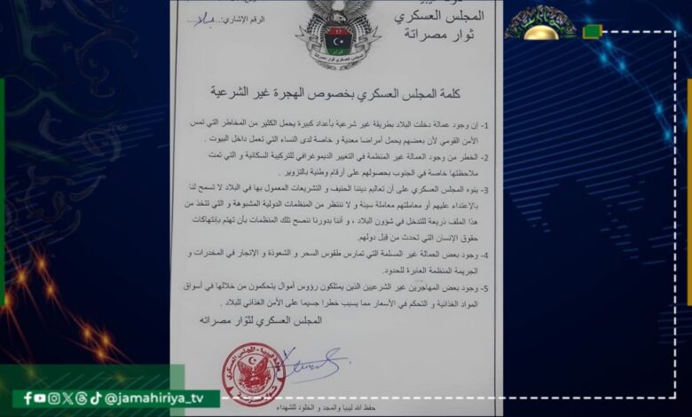 أكد المجلس العسكري لثوار مصراتة، أن انتشار العمالة غير المنظمة من المهاجرين غير الشرعيين، يهدد الأمن القومي، لافتا إلى أن دخول العمالة بطريقة غير شرعية بأعداد كبيرة يحمل الكثير من المخاطر التي تمس الأمن القومي.