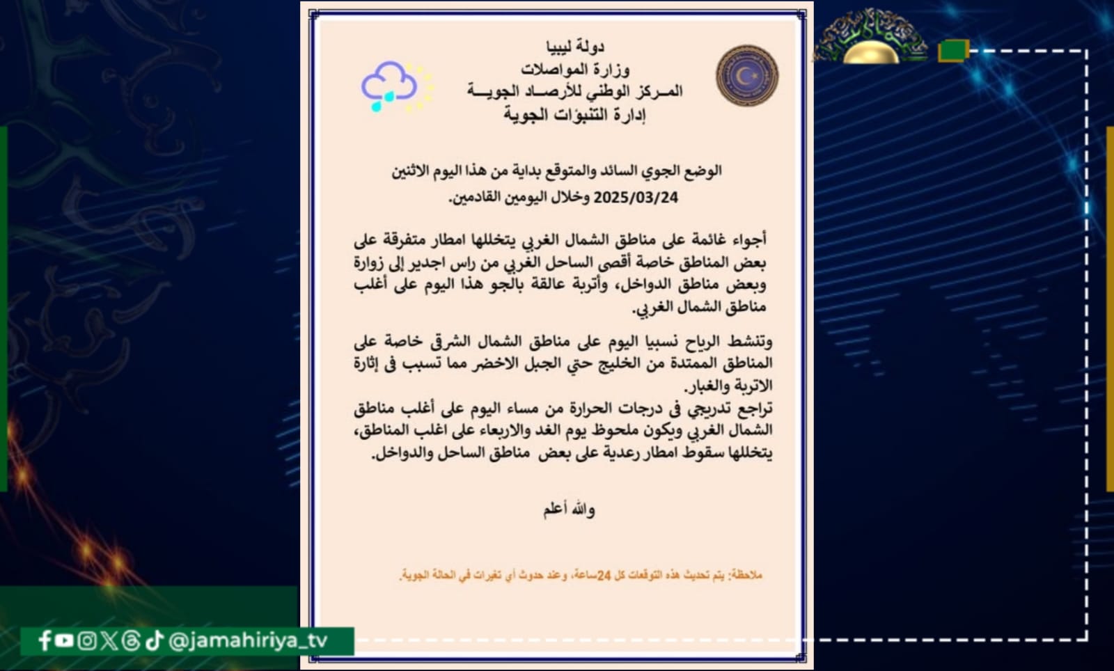 وجاء بيان الأحوال الجوية المتوقعة على ليبيا اليوم كالتالي: