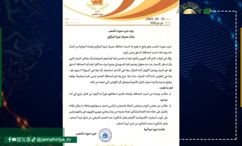 اتهم حزب صوت الشعب، ناجي عيسى محافظ المصرف المركزي ولجنته، في بيان، بالفشل الذريع في أداء مهامهم، والانشغال بلقاءات السفراء، وطالبهم في بتقديم استقالتهم فورًا.