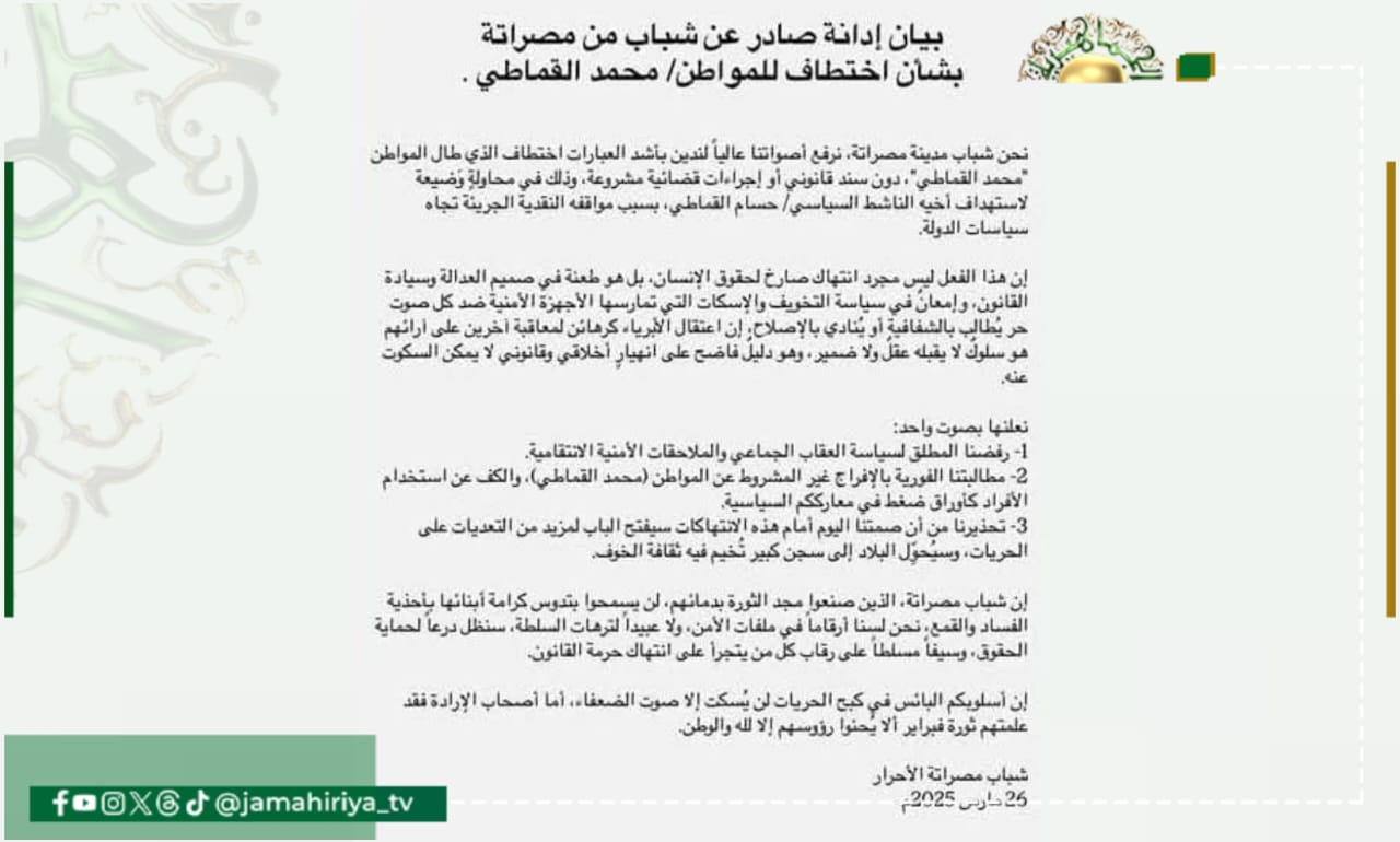 دان شباب مدينة مصراتة، بأشد العبارات اختطاف المواطن محمد القماطي، دون سند قانوني أو إجراءات قضائية مشروعة.