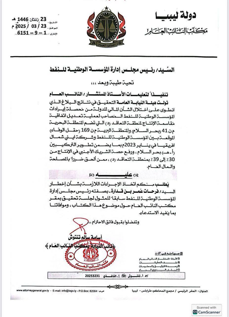 أصدر النائب العام خطابًا رسميًا إلى مؤسسة النفط يطالب فيه بتعليق تصدير الشحنات النفطية المشتبه في وجود مخالفات بها، مع توجيه إخطار إلى رئيس المؤسسة فرحات بن قدارة للمثول أمامه للتحقيق.