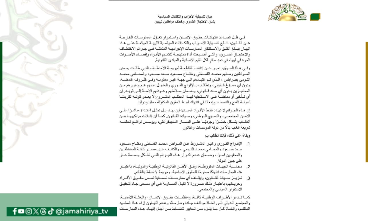 أعربت تنسيقية الأحزاب والتكتلات السياسية عن قلقها العميق واستنكارها الشديد لتزايد جرائم الاختطاف والاحتجاز القسري في ليبيا، معتبرةً أن هذه الممارسات الإجرامية أصبحت وسيلة ممنهجة لإسكات الأصوات الحرة، في انتهاك صارخ للقيم الإنسانية والمبادئ القانونية.