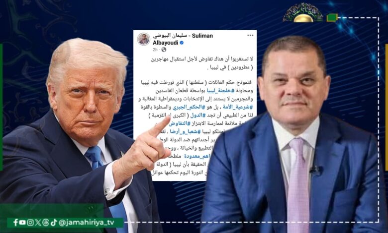 وقال البيوضي، في منشور على صفحته بموقع التواصل الاجتماعي “فيسبوك”، ” لا تستغربوا أن هناك تفاوض لاستقبال مهاجرين مطرودين في ليبيا، فنموذج حكم العائلات الذي تورطت به ليبيا، بواسطة قطعان الفاسدين والمجرمين، هو الحكم الجبري والسطوة بالقوة”، مضيفا ” لذا من الطبيعي أن تجد الدول مساحة ملائمة لممارسة الابتزاز مع من يعتقدون أنهم امتلكوا ليبيا، شعبًا وأرضًا”.