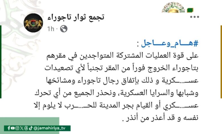 تجمع ثوار تاجوراء: نحذر المشتركة مصراتة من أي تحرك عسكري أو القيام بجر المدينة للحرب