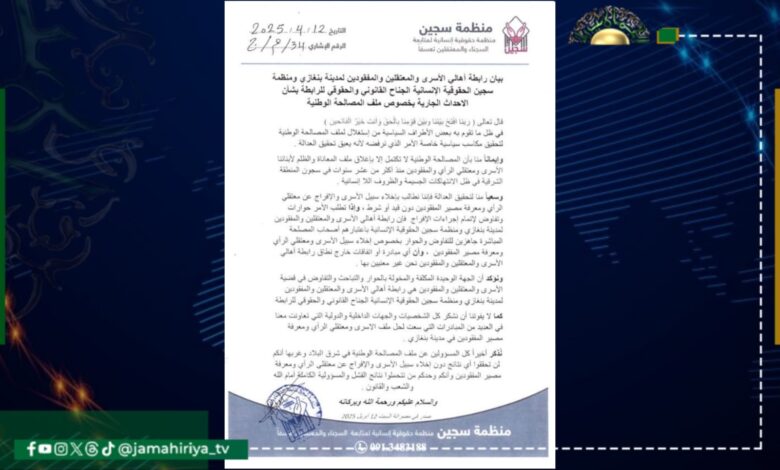 أصدرت رابطة أهالي الأسرى والمعتقلين والمفقودين لمدينة بنغازي ومنظمة سجين الحقوقية الإنسانية، بيانًا حول الأحداث الجارية المتعلقة بملف المصالحة الوطنية. وأكدت الرابطة على رفضها استغلال بعض الأطراف السياسية لملف المصالحة الوطنية لتحقيق مكاسب سياسية خاصة، مشيرة إلى أن هذا الاستغلال يعيق تحقيق العدالة المنشودة.
