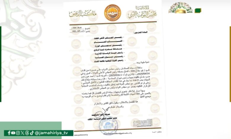 وسط انقسام شديد وجّه عقيلة صالح، رئيس مجلس النواب، خطابًا رسميًا إلى عدد من الجهات السيادية أكد خلاله عدم الاعتداد بقرار محمد تكالة تكليف أحمد عون ضو رئيسًا لديوان المحاسبة.