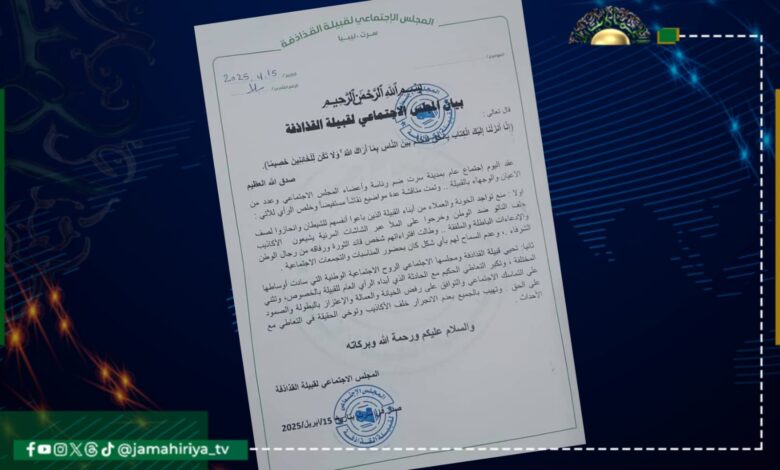 عاجل// المجلس الاجتماعي لقبيلة القذاذفة يصدر بيانا عقب اجتماع عام بمدينة سرت ضم رئاسة وأعضاء المجلس الاجتماعي وعدد من الأعيان والوجهاء بالقبيلة.