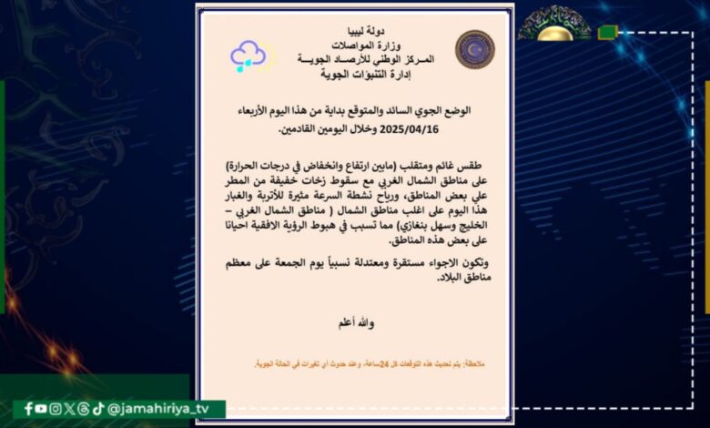 وجاء بيان الأحوال الجوية المتوقعة على ليبيا اليوم كالتالي