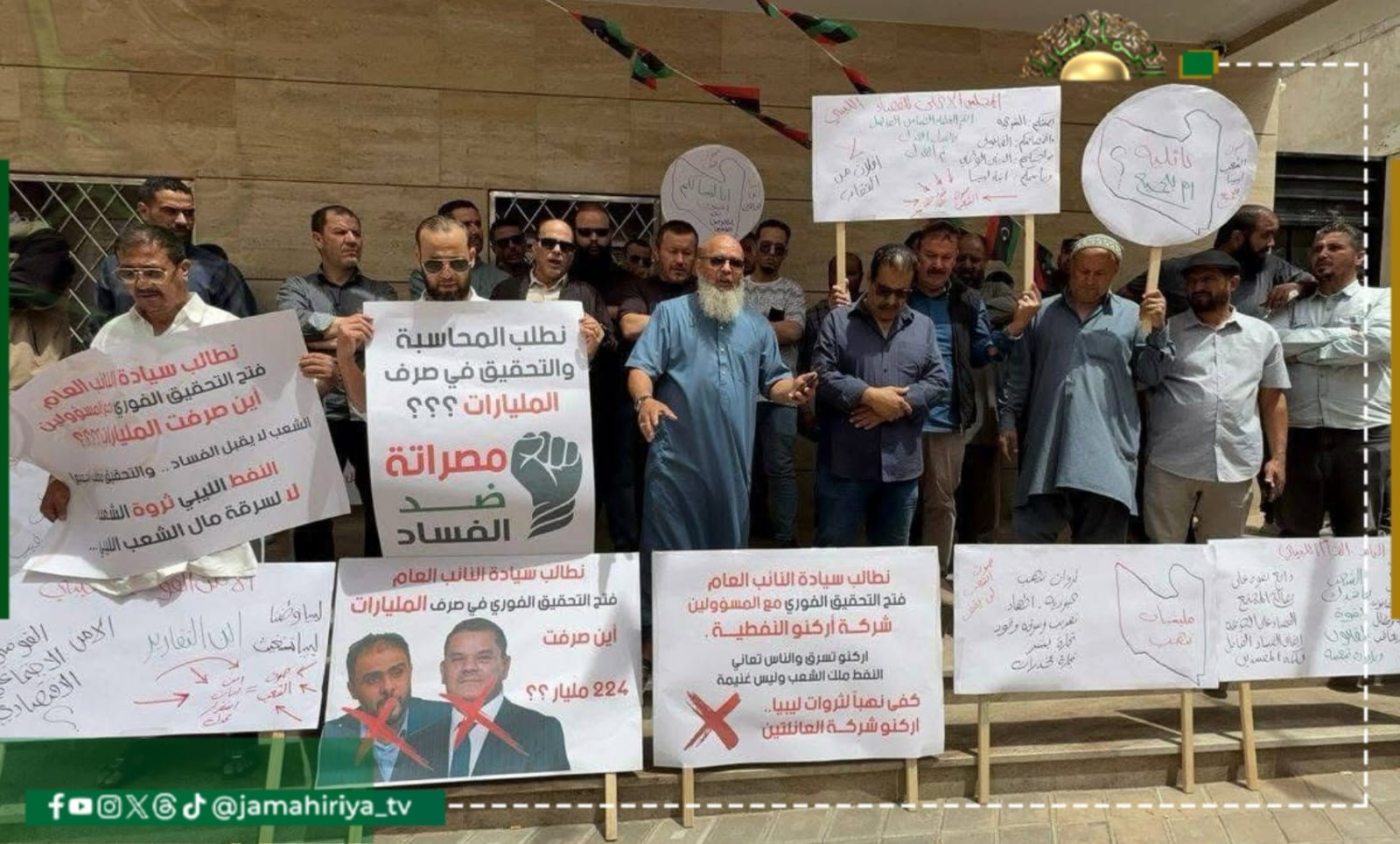 واكد المحتجون ضرورة محاسبة عادلة وشاملة لكل المتورطين دون استثناء أو محاباة، داعين الشعب الليبي، لمواجهة الفساد وسرقة قوتهم.
