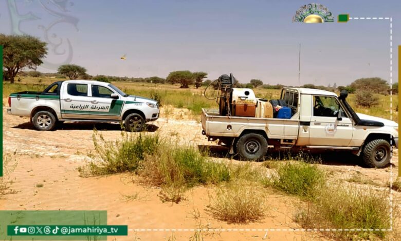 باشرت دورية تابعة لفرع جهاز الشرطة الزراعية في بني وليد، بالتعاون مع قطاع الزراعة والثروة الحيوانية ومكتب مكافحة الجراد، تنفيذ حملة رش الجراد الصحراوي بالمبيدات.