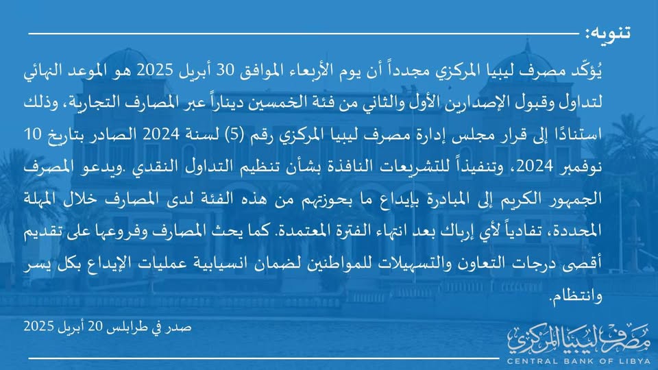 جدد مصرف ليبيا المركزي، تأكيده أن يوم الأربعاء الموافق 30 أبريل 2025 هو الموعد النهائي لتداول وقبول الإصدارين الأول والثاني من فئة الخمسين ديناراً عبر المصارف التجارية.