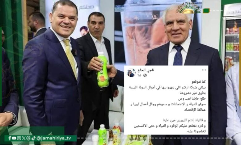 وقال الحاج، في منشور على صفحته بموقع التواصل الاجتماعي ” فيسبوك”، ” كنا نتوقع أن تلغي شركة “أركنو” اللي ينهبو بيها في أموال الدولة الليبية بطرق غير مشروعة طلع جابلنا لصوص سرقوا الدولة بالاعتمادات وسموهم رجال أعمال”.