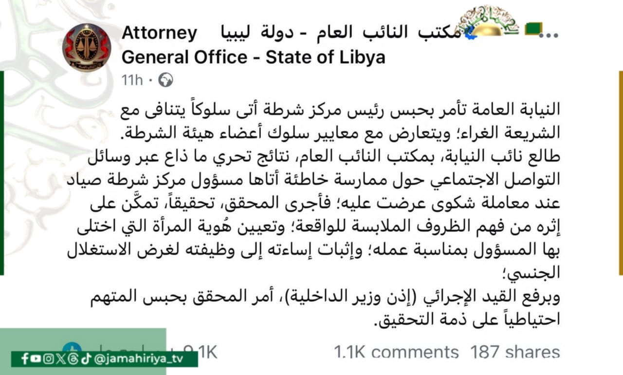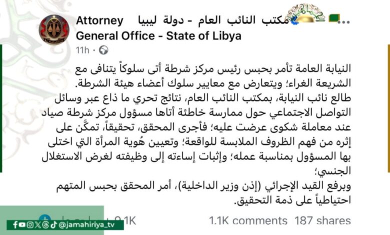 أمرت النيابة العامة، بحبس رئيس مركز شرطة صياد فوزي اللافي، بعد فضيحة استغلال منصبه للابتزاز الجنسي، بحسب بيان صادر عن مكتب النائب العام.