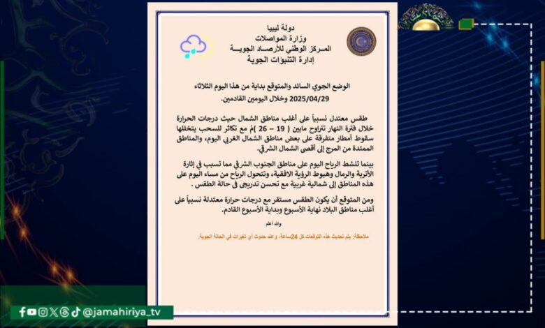 حالة السماء: قليلة السحب تتكاثر من حين إلى آخر يتخللها سقوط أمطار متفرقة خاصة على المناطق الممتدة من المرج إلى أقصى الساحل الشرقي يصحبها خلايا رعدية أحياناً.
