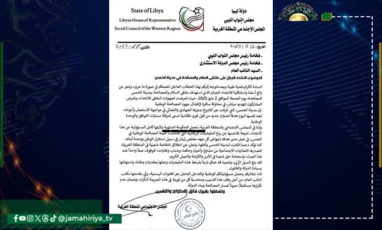 وأكد المجلس الاجتماعي المنطقة الغربية، في بيان رفضه التام لذلك منوها بمدينة الخمس التي عُرفت عبر التاريخ بدورها الجهادي والنضالي في مواجهة الاستعمار وأعوانه، والتي تجد نفسها اليوم هدفاً لعدوان جديد من قبل قوى ظلامية تسعى لعرقلة مسارات التوافق والوحدة.