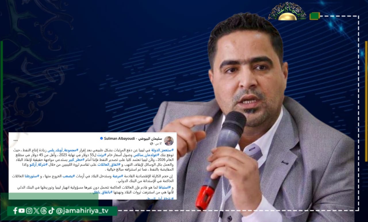 واختتم البيوضي، إنه استباقًا لما هو قادم، فإن العائلات الحاكمة تتحمل دون غيرها مسؤولية انهيار ليبيا وتوريطها في البنك الدولي، لأنها هي من استنزفت ثروات البلاد ونهبتها باتفاق باطل.