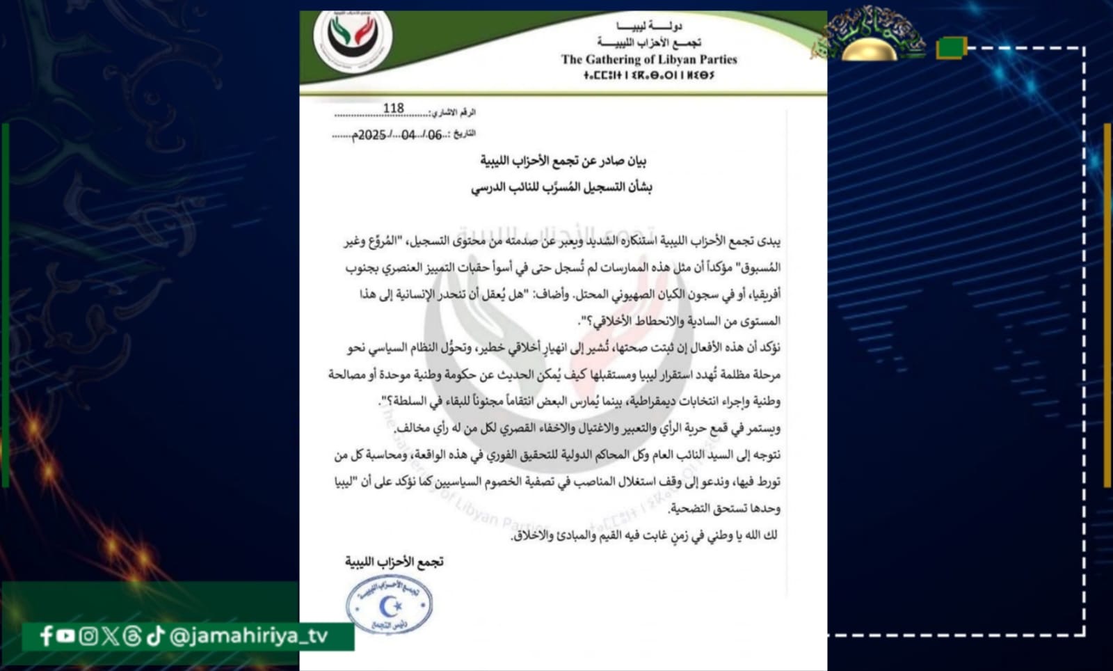 استنكر تجمع الأحزاب الليبية محتوى التسجيل، المروّع للنائب المختطف إبراهيم الدرسي.