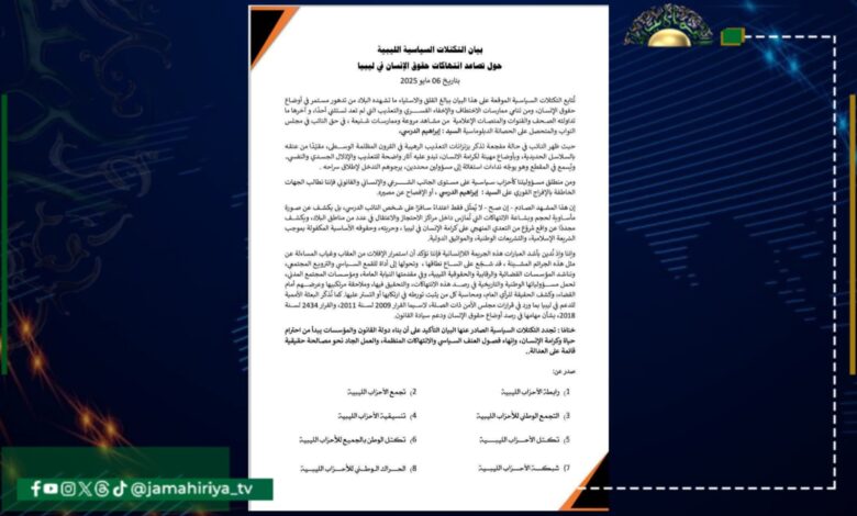 وناشدت المؤسسات القضائية والرقابية والحقوقية الليبية وفي مقدمتها النيابة العامة، ومؤسسات المجتمع المدني رصد هذه الانتهاكات، والتحقيق فيها وملاحقة مرتكبيها.