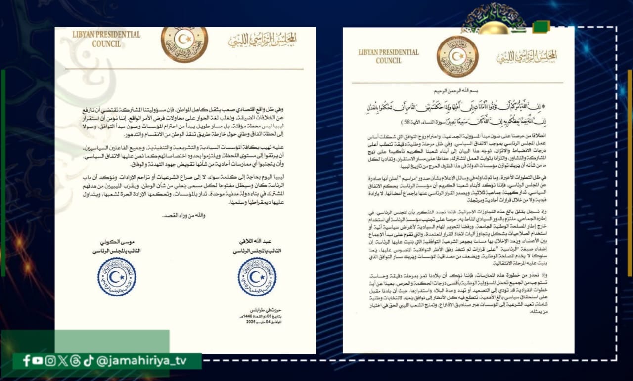 وأشار البيان، إلى أن إصدار أي قرار باسم المجلس يجب أن يتم بإجماع الأعضاء الثلاثة دون انفراد، مبينا أن ما تم تداوله إعلاميًا عن “إعلان رئاسي” لا يمثل المجلس ولا يعبر عن إرادته الجماعية.