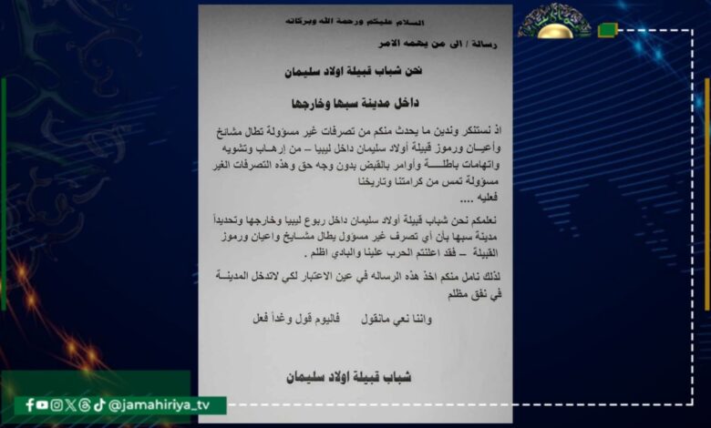 حذر شباب قبيلة أولاد سليمان داخل مدينة سبها وخارجها من أي تصرفات غير مسؤولة تطال مشائخ وأعيان ورموز القبيلة.