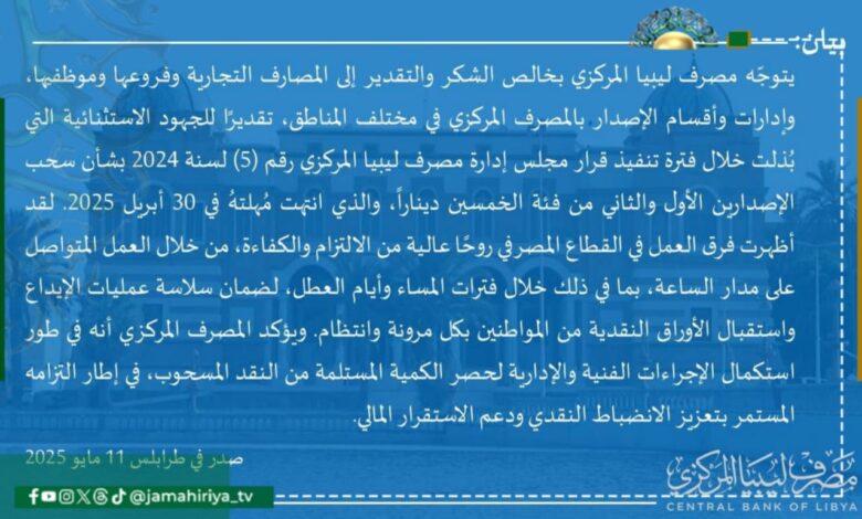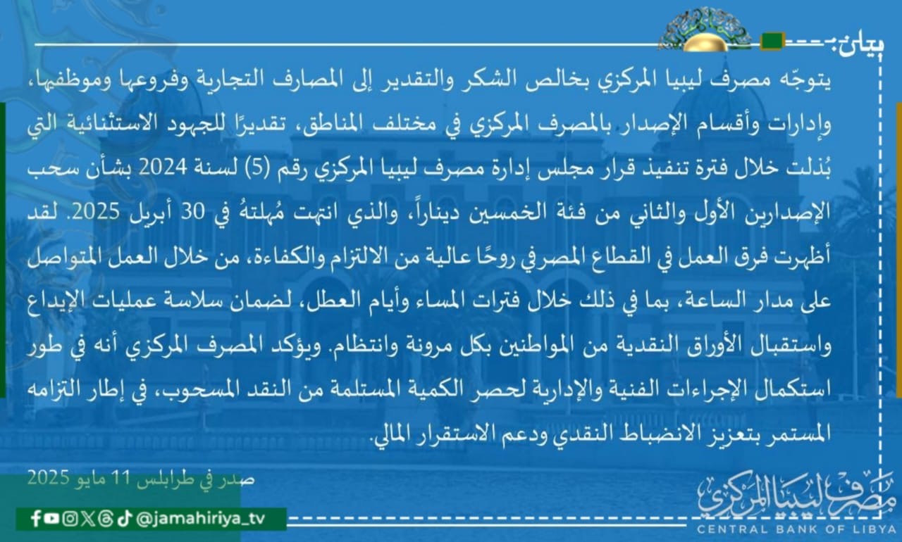 الرئيسية/محلي/عاجل| مصرف ليبيا المركزي يعلن انتهاء مهلة سحب الإصدارين الأول والثاني من فئة الـ50 دينارا. محلي عاجل| مصرف ليبيا المركزي يعلن انتهاء مهلة سحب الإصدارين الأول والثاني من فئة الـ50 دينارا. 11 مايو، 2025 11 مايو، 2025 فيسبوك تويتر بينتيريست واتساب تيلقرام ڤايبر مشاركة عبر البريد طباعة