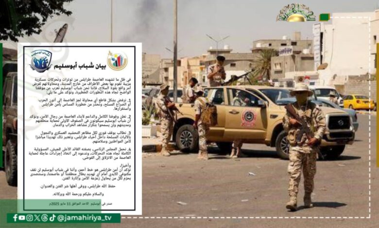 وطالب شباب أبو سليم، بوقف فوري لكل مظاهر التحشيد العسكري والتجول بالآليات المسلحة داخل أحياء طرابلس، واعتبروا ذلك تهديدًا مباشرًا لأمن المواطنين وسلامتهم.